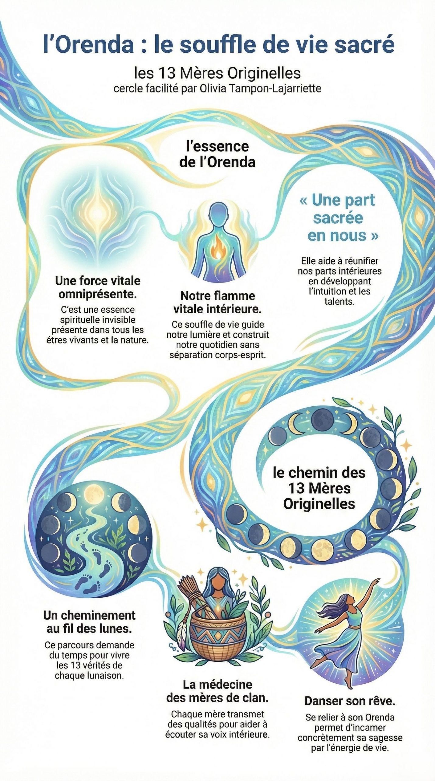 Ce chemin a besoin de temps long pour nous faire vivre les 13 vérités de chaque lunaison. Chaque Mère de Clan transmet sa médecine (valeurs, qualités, attitudes) qui aide à écouter sa petite voix intérieure, à suivre sa vérité et à « danser son rêve » à partir de son Orenda.