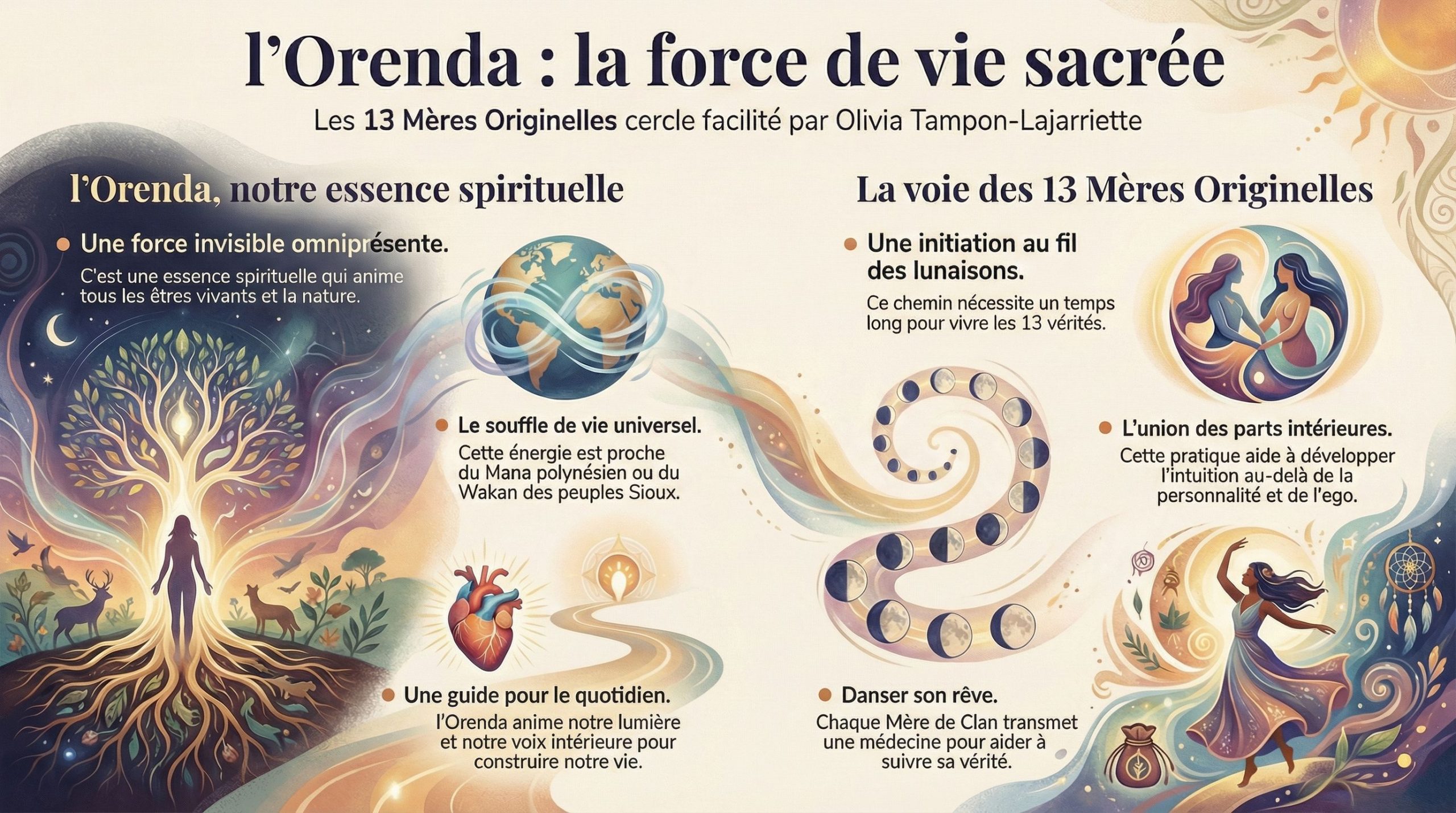 C’est pour cela que la voie des 13 Mères Originelles est une voie initiatique spirituelle incarnée : en se reliant à notre Orenda, nous nous mettons en mouvement grâce à cette énergie de vie. C’est une expansion par l’Amour (comme source de vie et non synonyme de couple bien entendu) qui te permet d’incarner concrètement ta sagesse intérieure dans le quotidien.